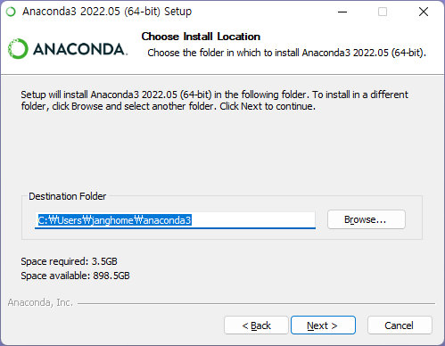 기본설치 경로는 C:\Users\janghome\anaconda3 입니다. janghome은 윈도우 사용자명으로 개인이 설정한 이름 입니다. 사용자명이 한글일 경우 아나콘다에서 인식하지 못합니다. 한글일 경우 C:\anaconda3 위치를 직접 지정하여 설치합니다.