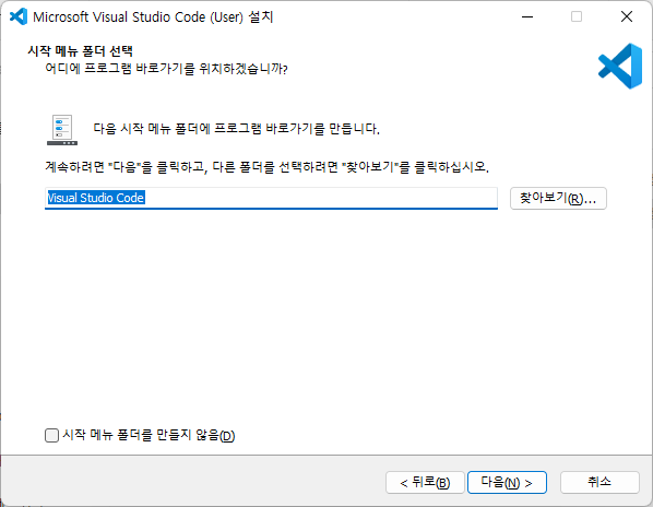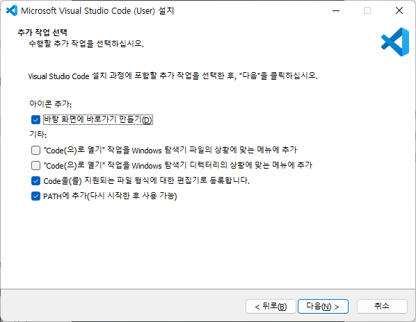 바탕화면에 vs code 아이콘의 바로가기를 만드는 옵션으로 선택하지 않아도 무방합니다.