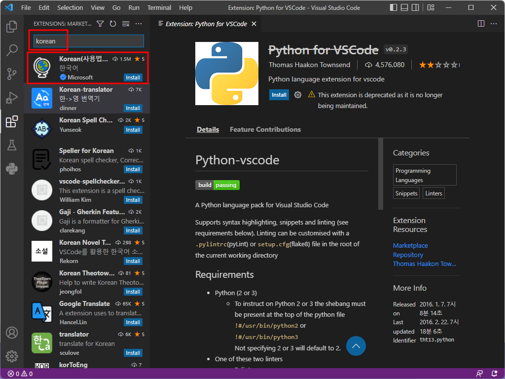 vs code를 설치하였고 파이썬 언어를 사용하기위한 추가기능을 설치하였습니다. 또한 vs code를 한국어로 사용사용하기 위해 korean팩을 설치하였습니다.