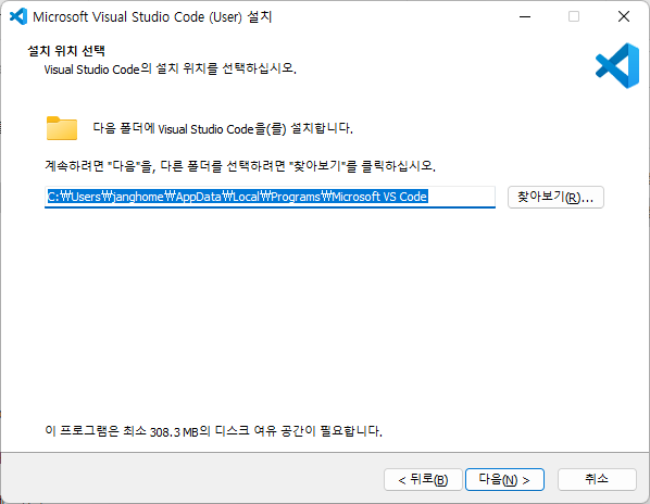 경로는 변경하지 않고 기본경로에 설치합니다. [다음]을 눌러 계속 진행합니다.
