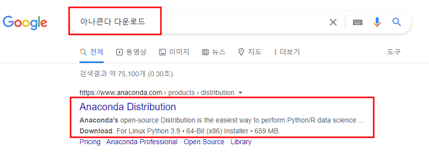 구글에서 아나콘다 다운로드 를 검색 후 다음의 사이트에 접속합니다.