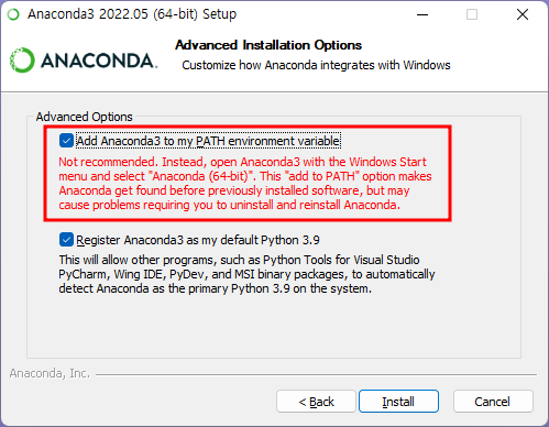 아나콘다의 정책이 변경되어 All Users 로 선택시 파이썬 Path를 자동등록하지 못합니다.