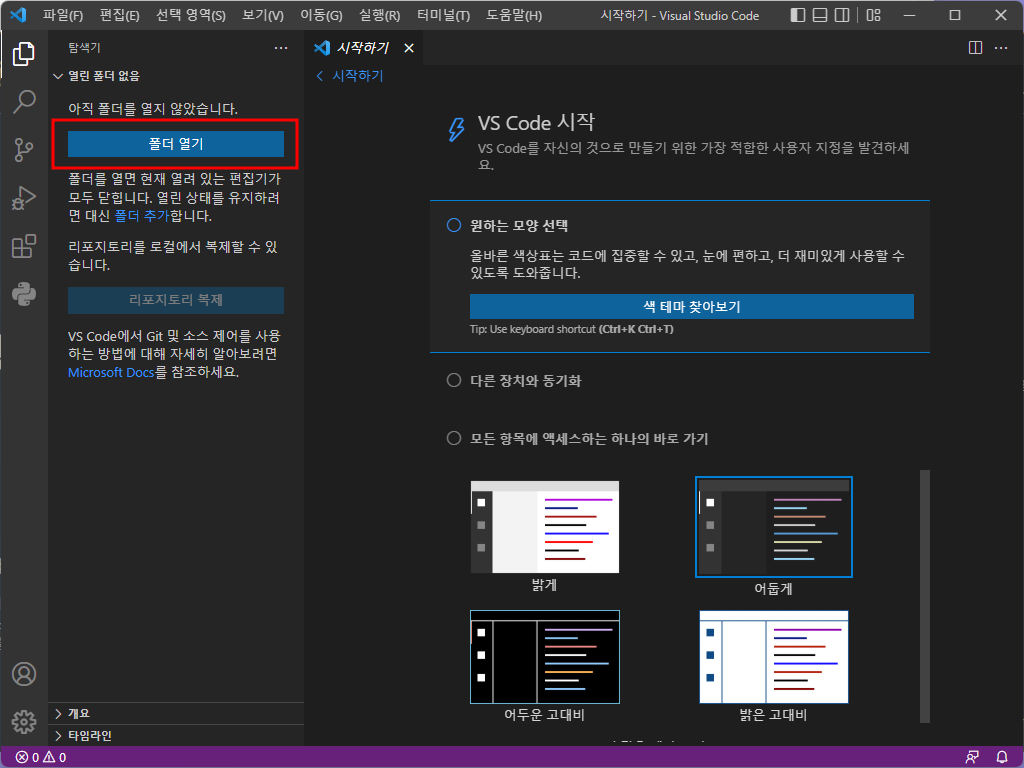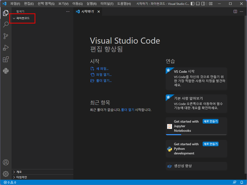 vs code는 [폴더] 별로 프로젝트를 관리합니다. [폴더 열기]를 클릭하여 파이썬 언어를 실행할 폴더를 생성하거나 기존의 폴더를 선택합니다.