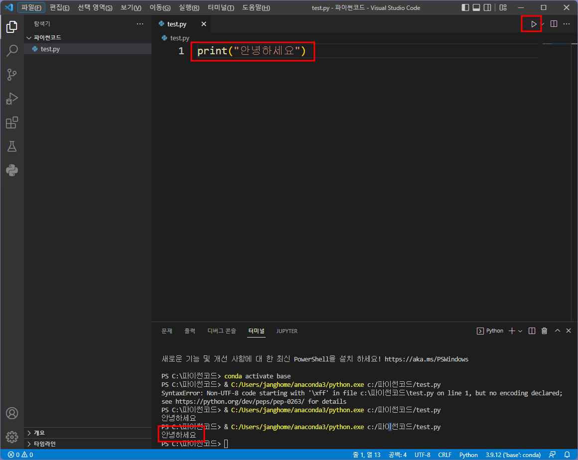 vs code에서 파이썬 코드 실행