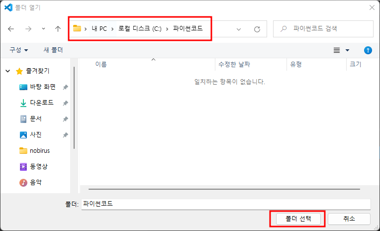 C드라이브 아래 [파이썬코드] 폴더를 생성하였습니다. 폴더를 선택 후 [폴더 선택] 을 클릭합니다.
