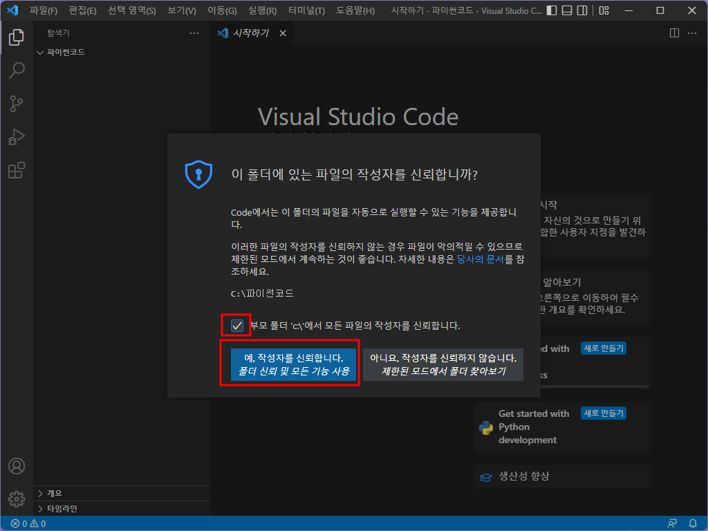 부모 폴더 에서 모든 파일의 작성자를 신뢰합니다. 를 체크 후 [예, 작성자를 신뢰합니다.]를 선택합니다.